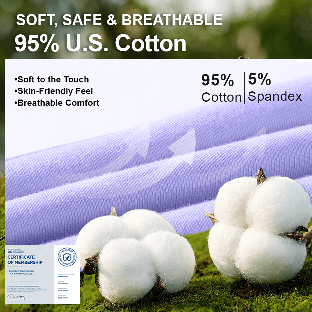 ♻️ Premium US Cotton – Soft, Safe & Sustainable: Made from high-quality US-grown cotton, these panties are breathable, gentle, and perfect for sensitive skin. OEKO-TEX certified and fluoride-free, they're as kind to the planet as they are to your body—pure comfort with zero compromises.